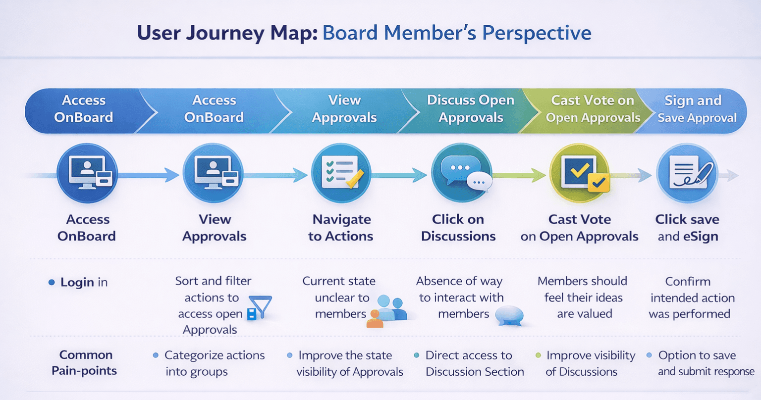 Conducted secondary research on board meeting workflows, governance processes, and approval activities.