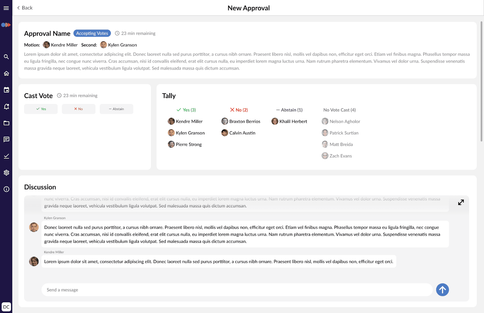 The open approval page was completely redone to maximize space and display lesser known features of the OnBoard system. On this page you see the same information that you would see in the expanded form of the approval card with the addition of an in depth tally of the votes and access to the discussion chat which wasn't widely available in the past.