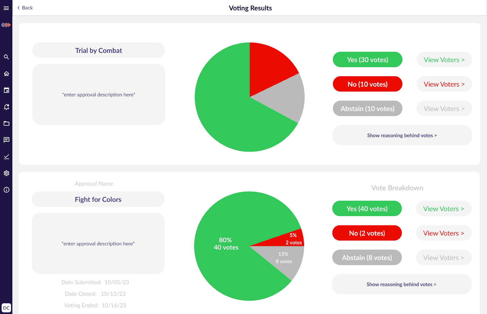 Once an approval is completed it will be moved to an archived section of the approval homepage. This page with display the same approval name, description, and results in a more visual breakdown with the ability to dive deeper if voters gave rationale for their decisions.